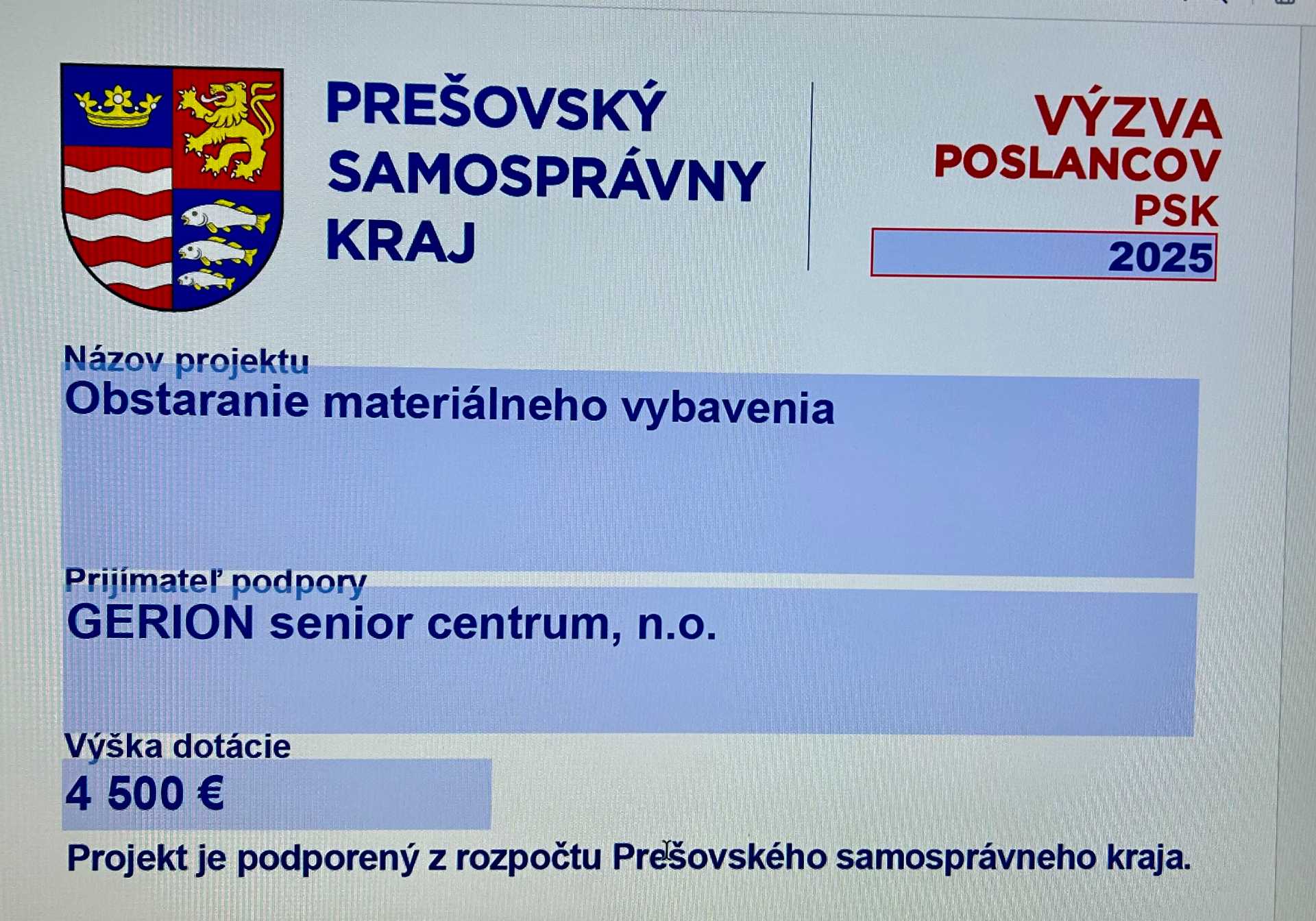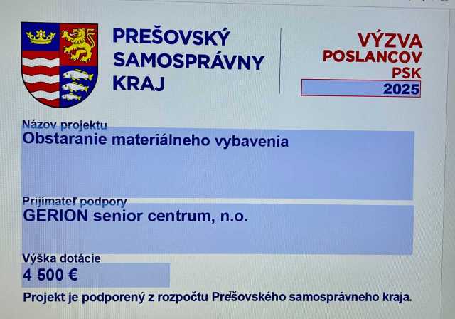 Na základe zmluvy č. 1157/2025/OPR o poskytnutí dotácie v zmysle VZN PSK č. 107/2024 o poskytovaní dotácií z vlastných príjmov Prešovského samosprávneho kraja zariadenie GERION senior centrum, n.o. zrealizovalo projekt s názvom ,, Obstaranie materiálneho vybavenia”, bola pridelená dotácia z výzvy PSK vo výške 4 500 €.